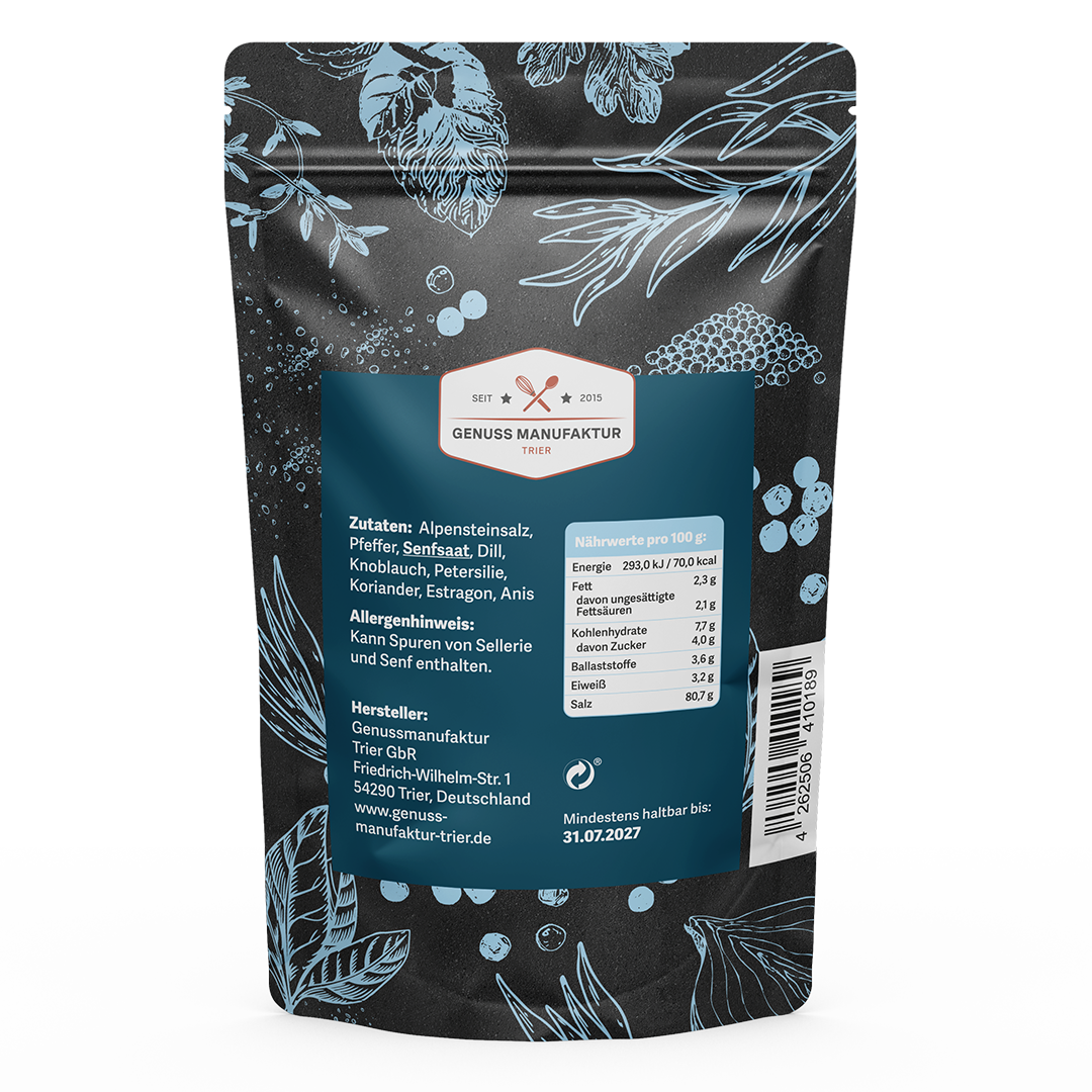 Alpensteinsalz, Pfeffer, Senfsaat, Dill, Knoblauch, Petersilie, Koriander, Estragon, Anis